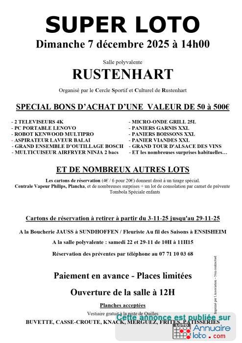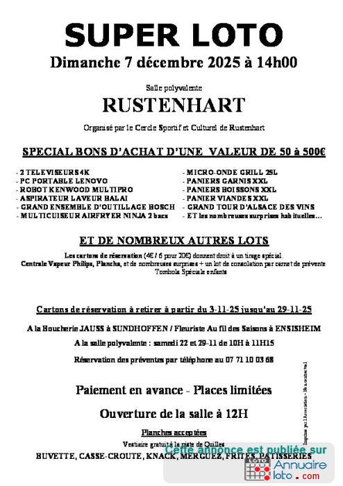 Le super Loto de Rustenhart aura lieu le dimanche 7 décembre2025 à partir de 14h00