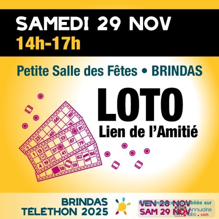 Vous voulez vous faire plaisir en participant au loto du Téléthon de Brindas et faire un geste pour la recherche médicale alors RDV à la petite salle des fêtes, le samedi 29 novembre à 14h. La somme récoltée pour l'achat des grilles (5 euros l'une et 12 euros les 3) sera intégralement reversée au Téléthon.
