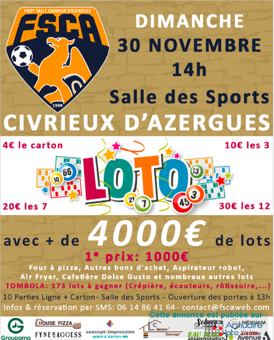 SUPER LOTO organisé par le FOOT SALLE CIVRIEUX D’AZERGUES (FSCA) à la Salle des sports – route de Marcilly 69380 CIVRIEUX- D’AZERGUES.