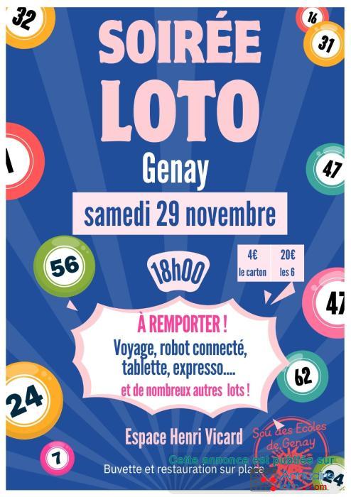 Samedi 29 novembre 2025 Ouverture des portes 18h00 - Début des parties 19h00 Hall des sports, Salle Henri Vicard, Genay (69) Vente des cartons sur place 4€ l’unité 20€ par lot de 6
