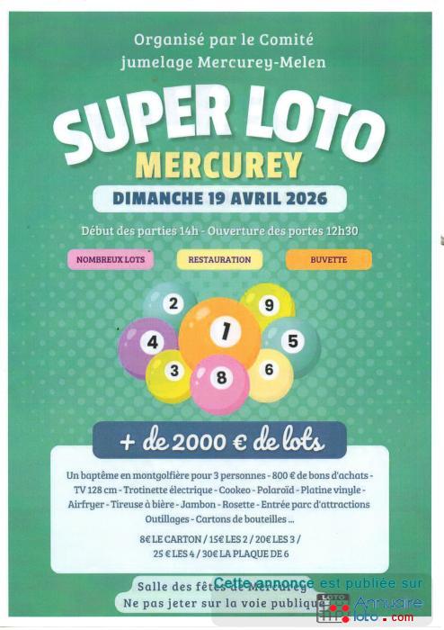 Super loto organisé par le Comité de jumelage Mercurey-Melen le dimanche 19 avril à la salle des fêtes de Mercurey.