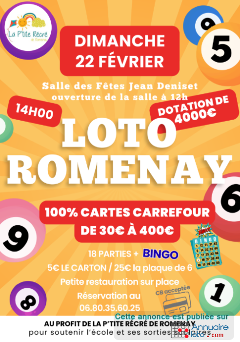 La p'tite récré de Romenay organise un loto, au profit de l'association de parents d'élèves de l'école de Romenay afin de pouvoir financer la sortie de fin d'année, et autres projets.