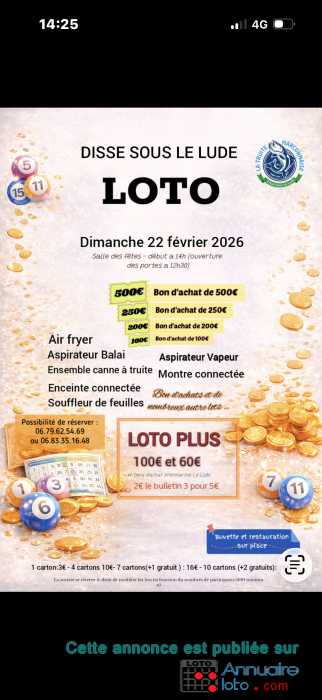 Super loto de l association la Truite Marconnaise à Dissé sous le Lude 72 salle des fetes communale .