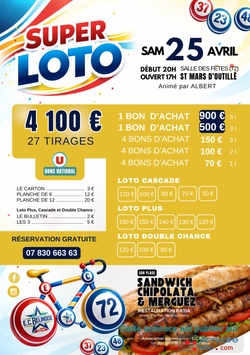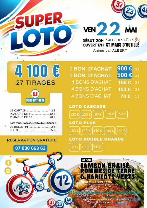Ne manquez pas le Grand Loto du 23 mai 2025 à la Salle des Fêtes de Saint-Mars-d’Outillé ! Plus de 4 000 € de gains à remporter avec des bons d’achat et gros lots. Ouverture dès 17h, début à 20h. 29 tirages pour maximiser vos chances de gagner ! Animé par Albert, ambiance assurée.