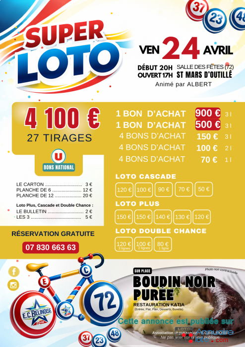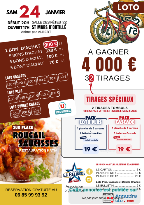 Ne manquez pas le Grand Loto du 25 avril 2025 à la Salle des Fêtes de Saint-Mars-d’Outillé ! Plus de 3 800 € de gains à remporter avec des bons d’achat et gros lots. Ouverture dès 17h, début à 20h. Animé par Albert, ambiance garantie !