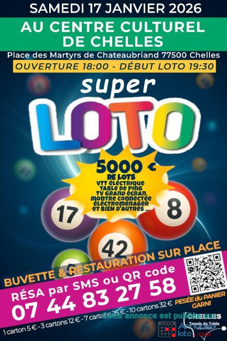 Le Club de Chelles Tennis de Table situé en Seine et Marne organise un loto avec 5000€de lots place des Martyrs de Chateaubriand 77500 Chelles le samedi 17 janvier 2026