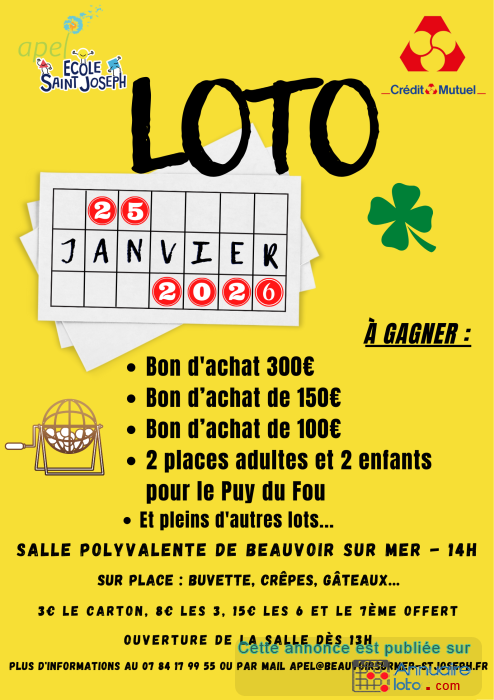 Grand Loto de l'APEL, école St Joseph, de nombreux lots à gagner !