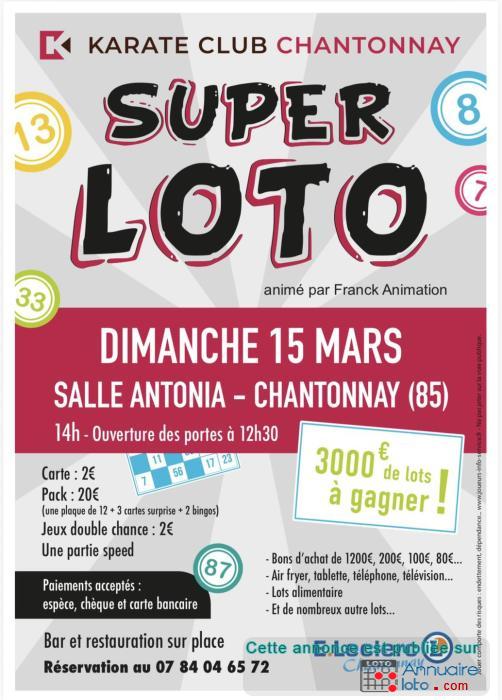 Super loto à 14H animé par Nathalie , 2500€ de lots à gagner , des cartes cadeaux dont une de 1000€ , Bourriche avec de superbes lots. Jetons sur place . Grand parking gratuit , la salle juxtapose le cinéma Antonia .