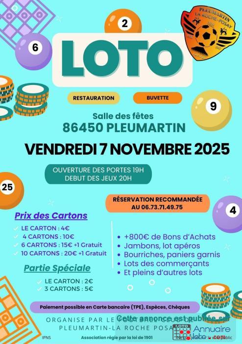 🎱 Le club organise son loto VENDREDI 07 NOVEMBRE 2025 à la salle des fêtes de Pleumartin.