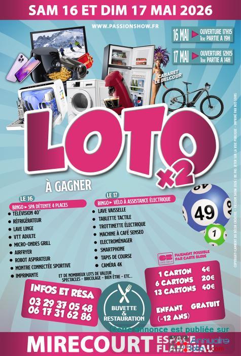 Passion Show organise 1 super Loto dont les bénéfices seront entièrement investis dans la 9ème édition du GRAND-SHOW – SPECTACLE DE VARIÉTÉS ET SCÈNE OUVERTE le samedi 3 octobre 2026 à Mirecourt. Nous comptons vivement sur vous, pour vous faire plaisir tout en contribuant ainsi à la réalisation d'un spectacle de variétés de haute tenue.