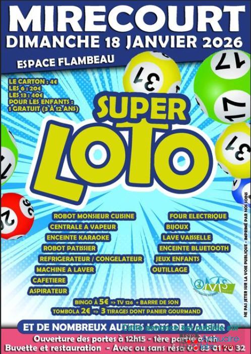 Le samedi 15 novembre, Passion Show organise 1 super Loto dont les bénéfices seront entièrement investis dans la 9ème édition du GRAND-SHOW – SPECTACLE DE VARIÉTÉS ET SCÈNE OUVERTE le samedi 3 octobre 2026 à Mirecourt. Nous comptons vivement sur vous, pour vous faire plaisir tout en contribuant ainsi à la réalisation d'un spectacle de variétés de haute tenue.