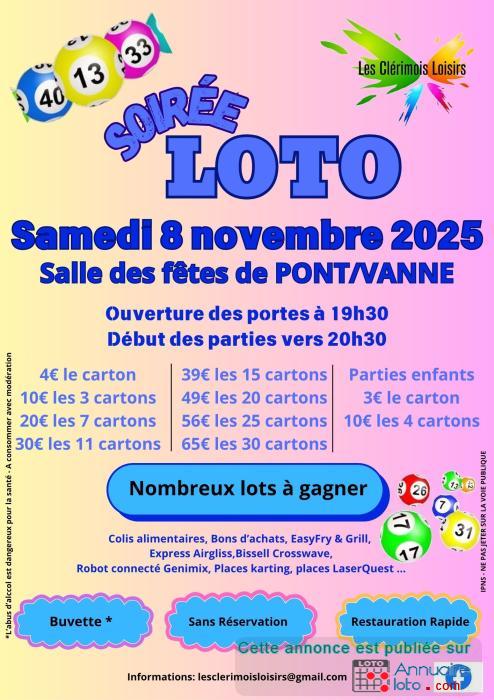 L'association Les Clérimois Loisirs organise une soirée Loto le samedi 8 novembre 2025, ouverture des portes et vente des cartons à partir de 19h30, début des parties 20h30. Deux parties enfants de moins de 11 ans pendant la soirée. Buvette, vente de Hot-dog et pâtisseries sur place.